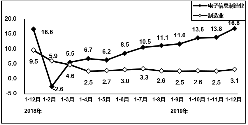 2019年,规模以上电子信息制造业增加值同比增长9.3%,增速比上年回落3.8个百分点。12月,规模以上电子信息制造业增加值同比增长11.6%,增速比上年提升1.1个百分点。