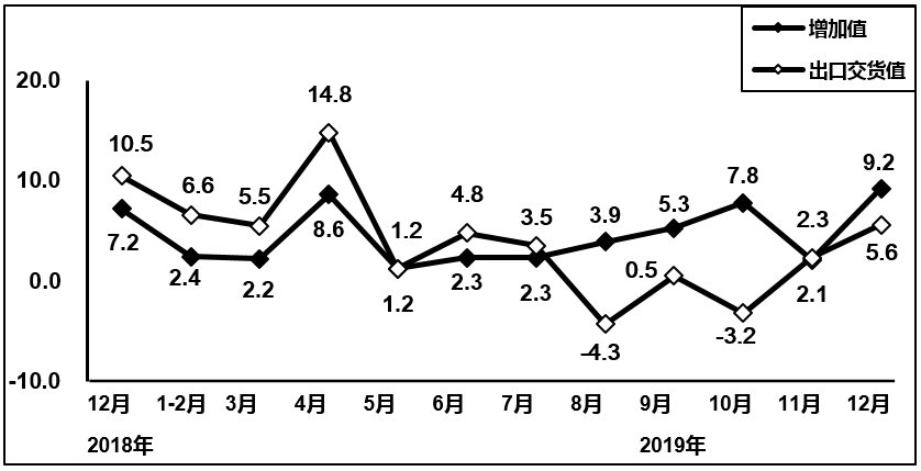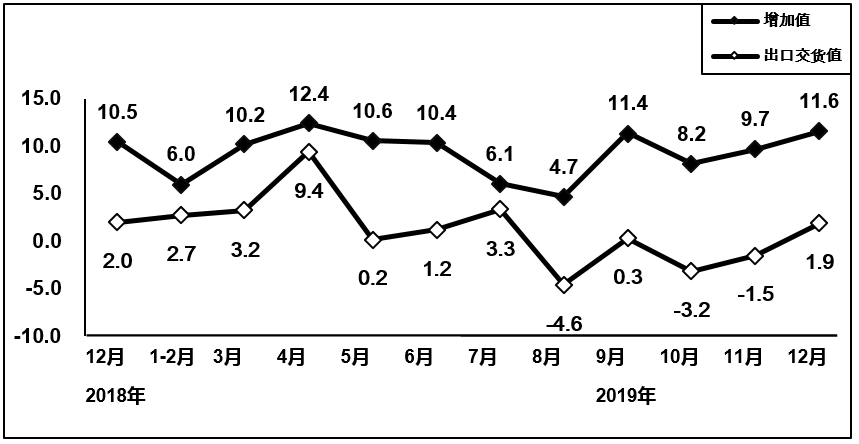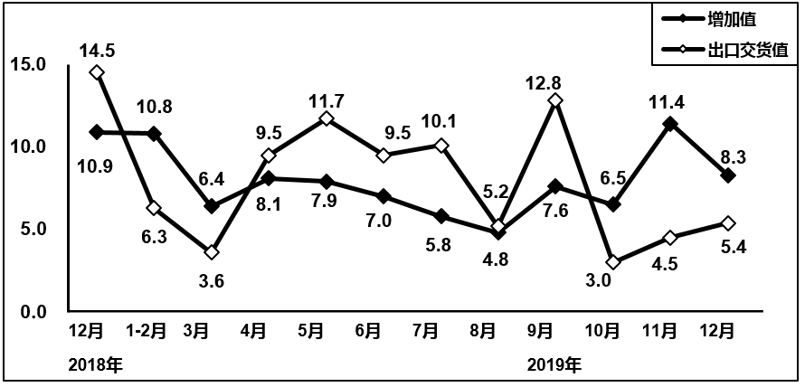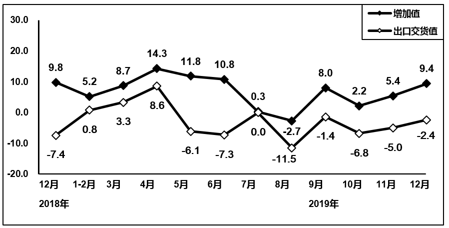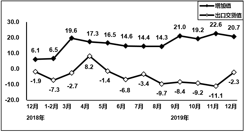 图1 2018年12月以来电子信息制造业增加值和出口交货值分月增速(%)