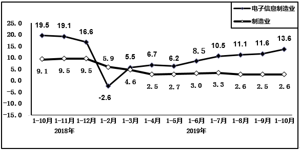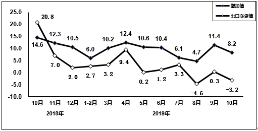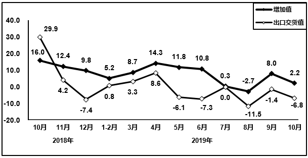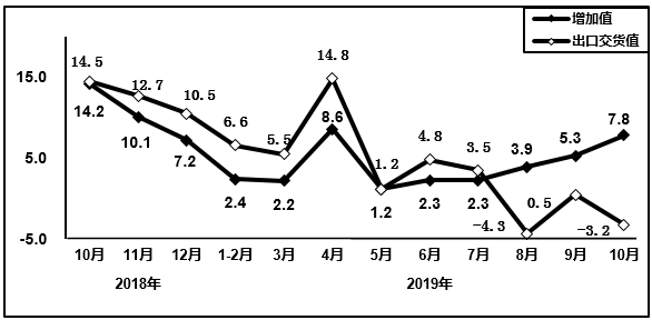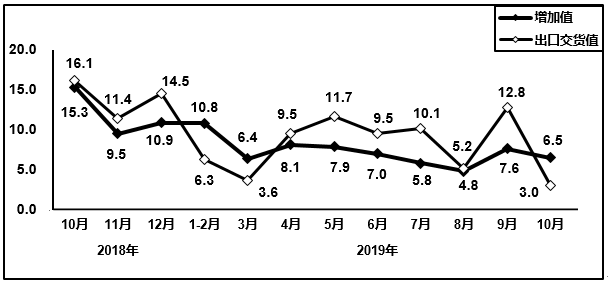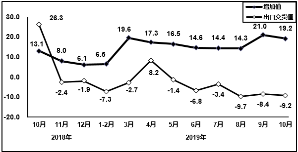图1 2018年10月以来电子信息制造业增加值和出口交货值分月增速(%)