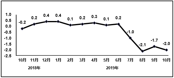图3 2018年10月以来电子信息制造业PPI分月增速(%)