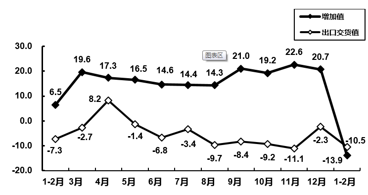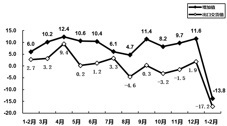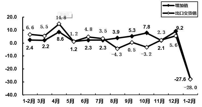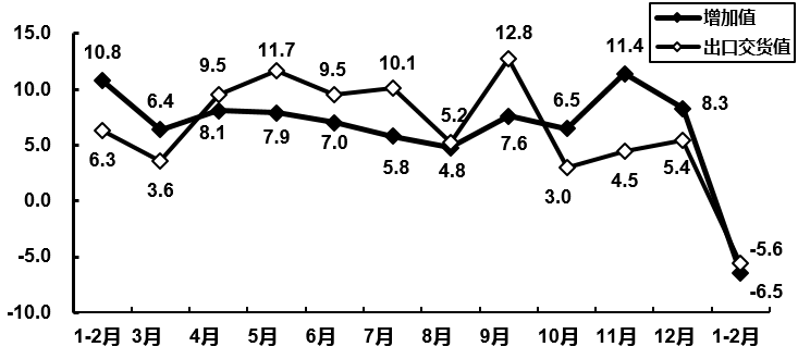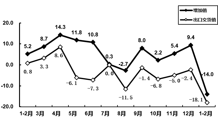 图1 2020年1-2月以来电子信息制造业增加值和出口交货值分月增速(%)