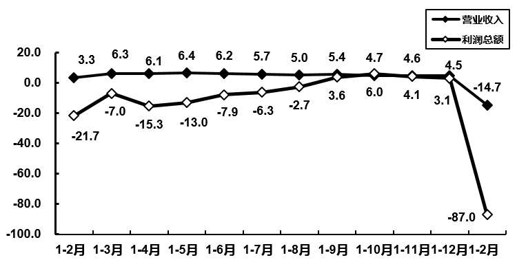1-2月份,计算机制造业营业收入同比下降26.2%,利润同比下降139.7%。