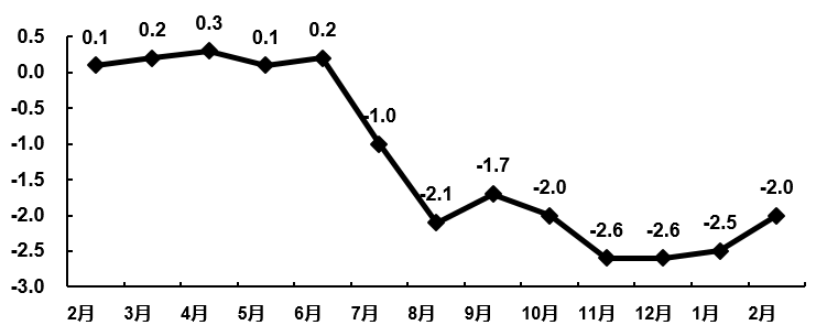 图3 2020年1-2月以来电子信息制造业PPI分月增速(%)