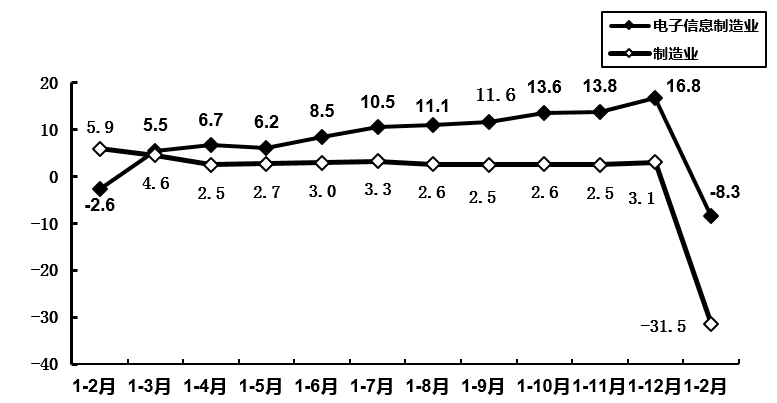1-2月份,电子信息制造业固定资产投资同比下降8.3%,比去年同期回落5.7个百分点。
