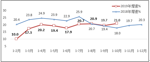 互联网业务收入加快增长。1-10月,我国规模以上[2]互联网和相关服务企业(简称互联网企业)完成业务收入9902亿元,同比增长21%,增速同比提高3个百分点,比1-9月增速提高1.3个百分点。