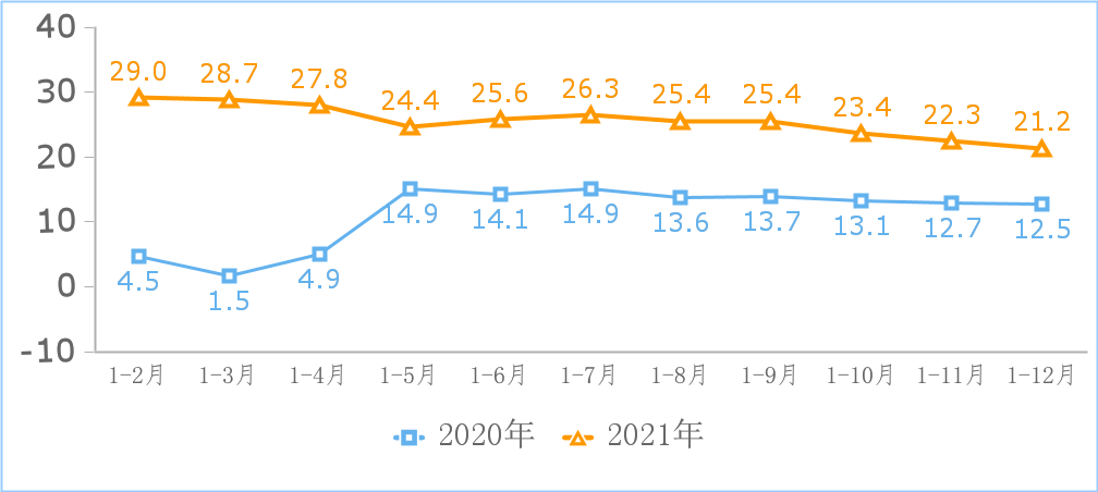 图1 2020-2021年月度互联网业务收入累计增长情况(%)