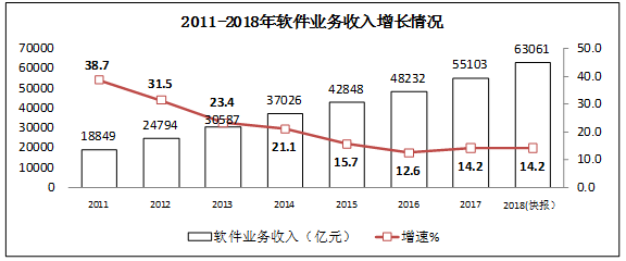 软件业务收入保持较快增长。2018年,全国软件和信息技术服务业规模以上①企业3.78②万家,累计完成软件业务收入63061亿元,同比增长14.2%③。