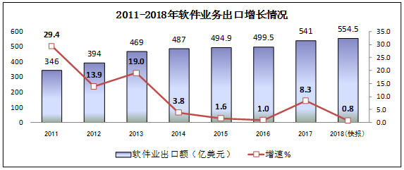 软件出口形势低迷。2018年,全国软件和信息技术服务业实现出口554.5亿美元,同比增长0.8%。