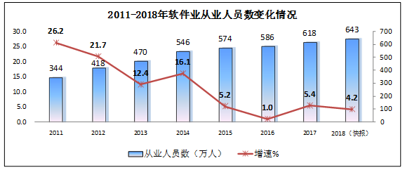 从业人数稳步增加。2018年,全国软件和信息技术服务业从业人数643万人,比上年增加25万人,同比增长4.2%。