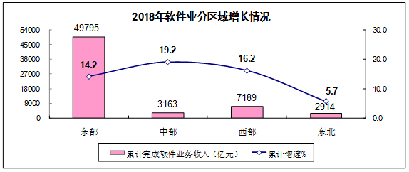 东部地区稳步发展,中西部地区软件业加快增长。2018年,东部地区完成软件业务收入49795亿元,同比增长14.2%,占全国软件业的比重为79.0%。中部和西部地区完成软件业务收入为3163亿元和7189亿元,分别增长19.2%和16.2%,高于全国增速5.0和2.0个百分点;占全国软件业的比重为5.0%和11.4%,同比均提高0.2个百分点。东北地区完成软件业务收入2914亿元,同比下降0.4个百分点,占全国软件业的比重为4.6%。