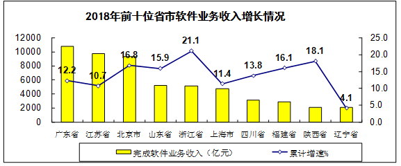 主要软件大省保持稳中向好,海南及部分中西部省市快速增长。软件业务收入居前5名的广东(增长12.2%)、江苏(10.7%)、北京(16.8%)、山东(15.9%)、浙江(21.1%)共完成软件业务收入40192亿元,占全国软件业比重的63.7%。软件业务收入增速高于全国平均水平的省市有19个,其中海南省同比增长达89.9%,西部的广西、青海、云南和贵州增长分别达77.0%、50.3%、23.7%和23.4%,中部的江西、安徽增长达37.7%和27.7%。