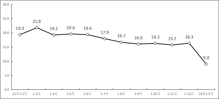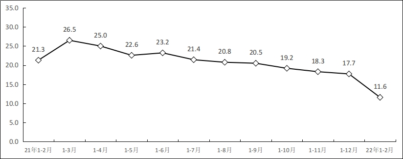 软件业务收入保持两位数增长。1-2月份,我国软件业务收入11792亿元,同比增长11.6%[1],增速较2021年全年回落6.1个点,较2020和2021年同期的两年平均增速提高8个百分点。