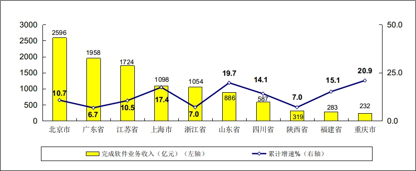 主要软件大省平稳向好发展。1-2月份,软件业务收入居前5名的省份中,北京、广东、江苏、上海和浙江软件业务收入分别为2596亿元、1958亿元、1724亿元、1098亿元和1054亿元,分别增长10.7%、6.7%、10.5%、17.4%和7.0%,五省(市)合计软件业务收入8430亿元,占全国比重为71.5%,占比较去年同期回落1个百分点。