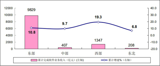 东部地区软件业收入增速有所回落,西部地区增势领先。1-2月份,东部地区完成软件业务收入9829亿元,同比增长10.8%,增速较2021年全年回落6.8个百分点;中部地区完成软件业务收入407亿元,同比增长9.7%,增速较2021年全年回落9.2个百分点;西部地区完成软件业务收入1347亿元,同比增长19.3%,高出全国平均水平7.7个百分点;东北地区完成软件业务收入208亿元,同比增长6.8%,增速较2021年全年回落5.3个百分点。四个地区软件业务收入在全国总收入中的占比分别为83.4%、3.5%、11.4%和1.8%。