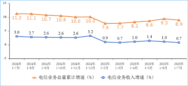 电信业务收入和总量保持平稳增长。前7个月,电信业务收入累计完成10431亿元,同比增长0.7%。按照上年不变价计算的电信业务总量同比增长8.9%。