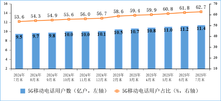 5G用户数快速增加。截至7月末,三家基础电信企业及中国广电的移动电话用户总数达18.15亿户,比上年末净增2508万户。其中,5G移动电话用户达11.37亿户,比上年末净增1.23亿户,占移动电话用户的62.7%。