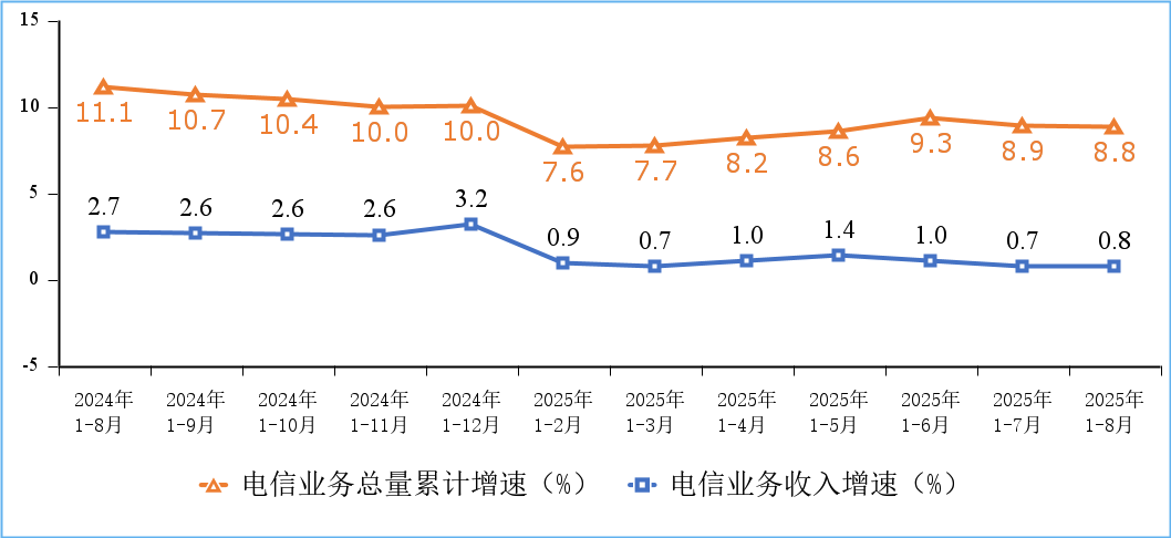 电信业务收入保持正增长,电信业务总量较快增长。前8个月,电信业务收入累计完成11821亿元,同比增长0.8%。按照上年不变价计算的电信业务总量同比增长8.8%。
