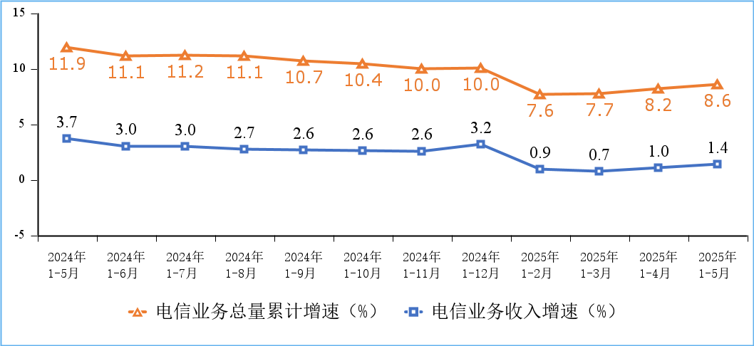 电信业务量收增速逐步提升。前5个月,电信业务收入累计完成7488亿元,同比增长1.4%。按照上年不变价计算的电信业务总量同比增长8.6%。
