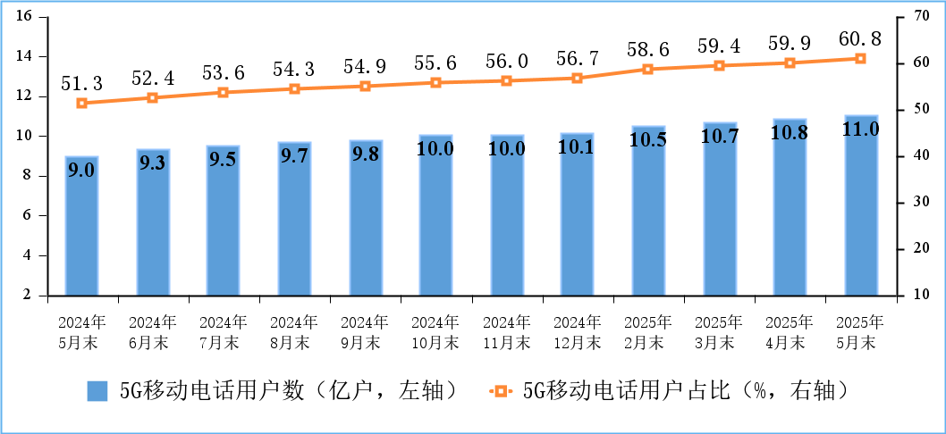 5G用户占比超六成。截至5月末,三家基础电信企业及中国广电的移动电话用户总数达18.07亿户,比上年末净增1699万户。其中,5G移动电话用户达10.98亿户,比上年末净增8414万户,占移动电话用户的60.8%。