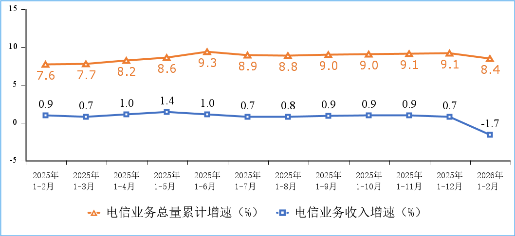 电信业务总量保持增长。前2个月,电信业务收入累计完成2904亿元,同比下降1.7%。按照上年不变价计算的电信业务总量同比增长8.4%。