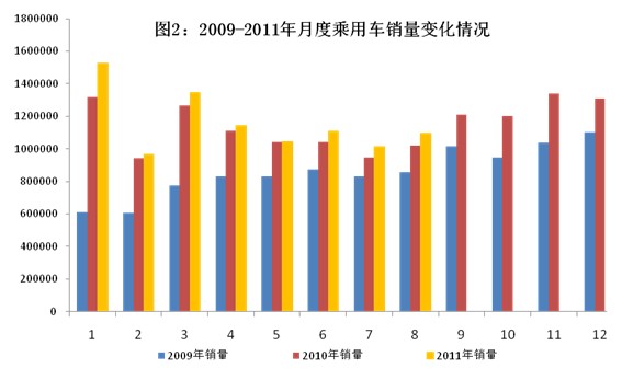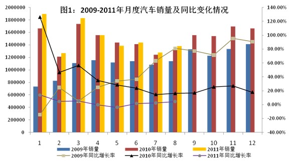 2011年1~8月,我国汽车产销量分别为1185.52万辆和1198.36万辆,同比分别增长3.04%和3.33%。8月,汽车产销市场同比和环比均保持小幅增长。