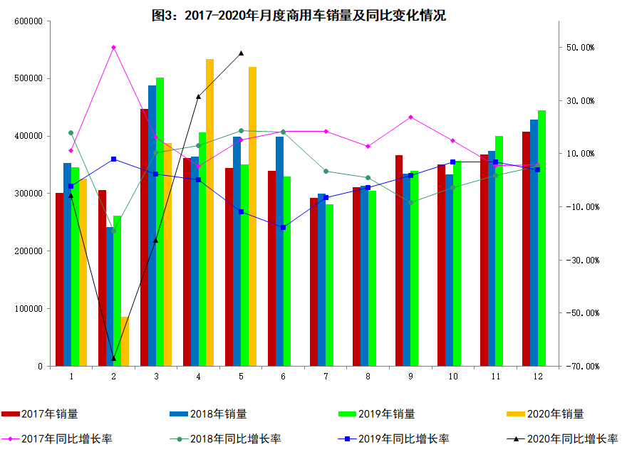 5月,商用车产销分别完成52.7万辆和52万辆,同比分别增长47.7%和48%。分车型看,货车产销分别完成49万辆和48.2万辆,同比分别增长53.2%和52.5%;客车产销分别完成3.7万辆和3.8万辆,同比分别增长0.3%和7.3%。