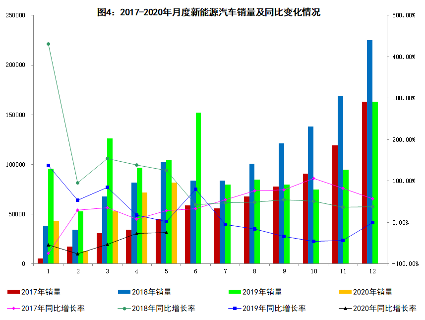 5月,新能源汽车产销分别完成8.4万辆和8.2万辆,同比分别下降25.8%和23.5%。分车型看,纯电动汽车产销分别完成6.3万辆和6.4万辆,同比分别下降33.8%和25.1%;插电式混合动力汽车产销分别完成2.1万辆和1.8万辆,其中产量同比增长17.1%,销量同比下降16.1%;燃料电池汽车产销分别完成17辆和42辆,同比分别下降94.6%和86.7%。
