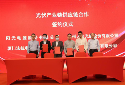 根据《关于促进光伏产业链供应链协同发展的通知》有关精神,光伏行业上下游务实加强合作对接,阳光电源股份有限公司和厦门法拉电子股份有限公司、银川隆基光伏科技有限公司和宁夏大学、锦州阳光能源有限公司和上饶捷泰新能源科技有限公司、TCL中环新能源科技股份有限公司和宁夏中晶新材料科技有限公司等多家单位,就长单供应、产品采购、技术合作等现场签署了合作协议。中国电子技术标准化研究院分别和中国华能集团清洁能源技术研究院有限公司、中国国检测试控股集团股份有限公司、国家太阳能光伏产品质量检验检测中心、湖州丽天智能科技有限公司等4家单位就光伏行业碳排放数据库开发与碳核算平台建设签署了合作备忘录。
