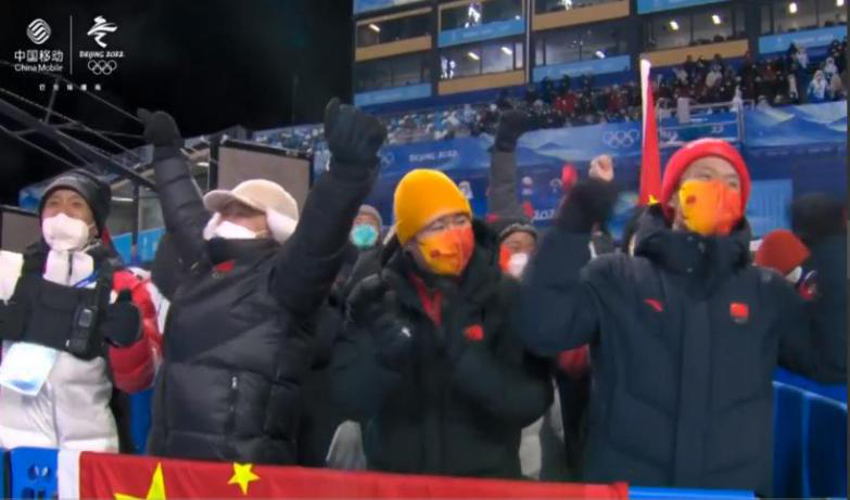 齐广璞的教练(白色外套)胸前佩戴无线对讲机设备(图片来自央视直播截图)