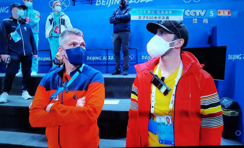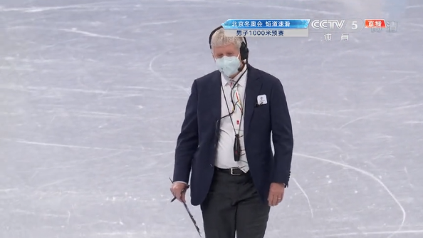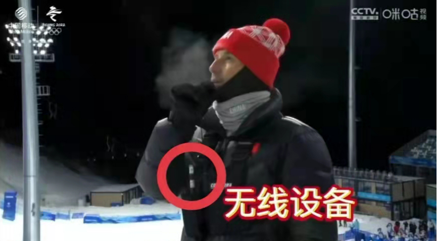 短道速滑佩戴无线对讲机设备的教练员(图片来自央视直播截图)