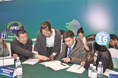 ■在青岛中小企业国际采购洽谈会上,青岛企业与外商面对面洽谈。