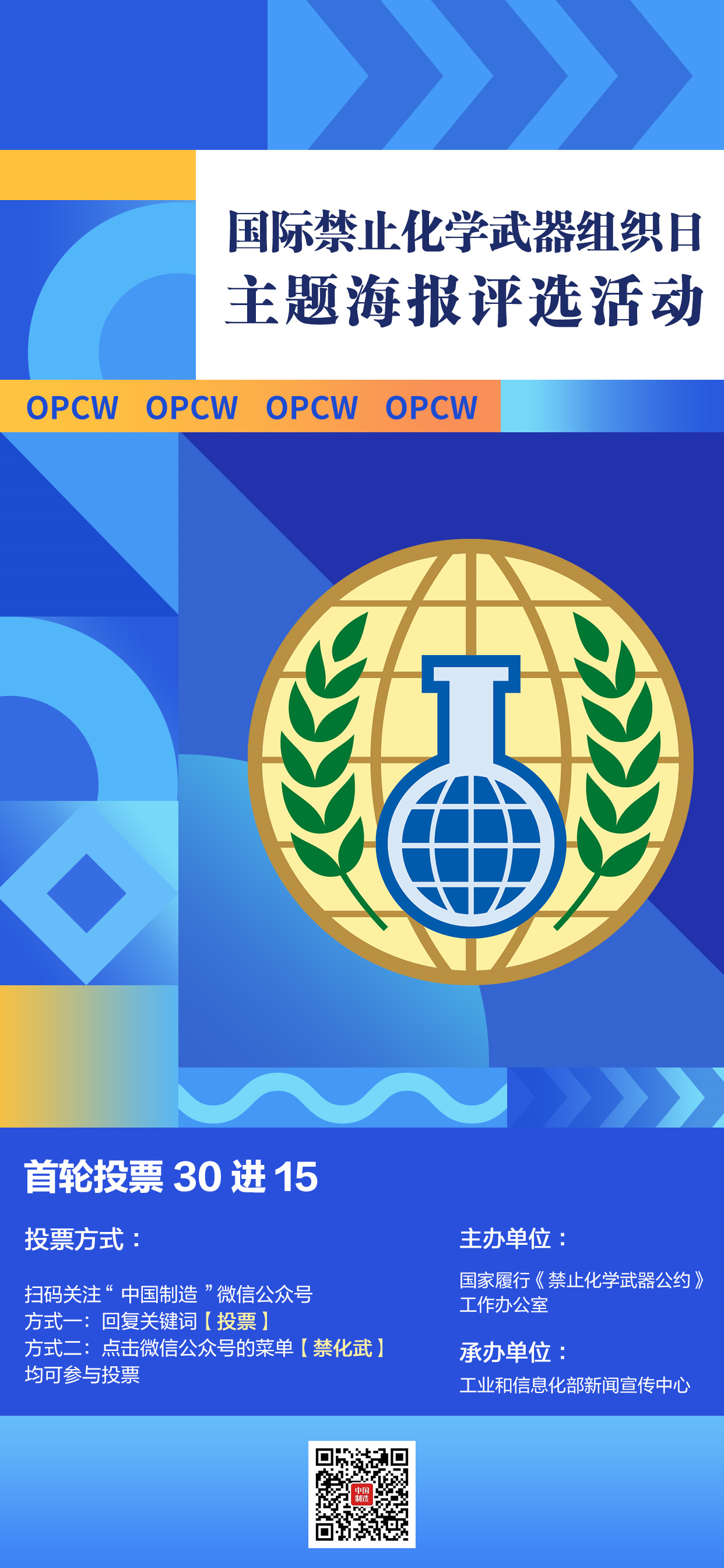 此次宣传海报线上评选投票共分两轮。第一轮30进15投票时间为即日起至4月23日;第二轮15进10投票时间为4月23日至24日。之后,国家禁化武办将结合公众投票结果和专家评审意见,确定两张主题宣传海报,并向主题宣传海报的设计者颁发证书,向入围作品设计者颁发纪念品。主题海报和入围作品将在工业和信息化部官网履行《禁止化学武器公约》工作专栏展示。(海报创意说明链接https://mp.weixin.qq.com/s/ZuTR-ZOdxpmO2ED-wrraoQ)