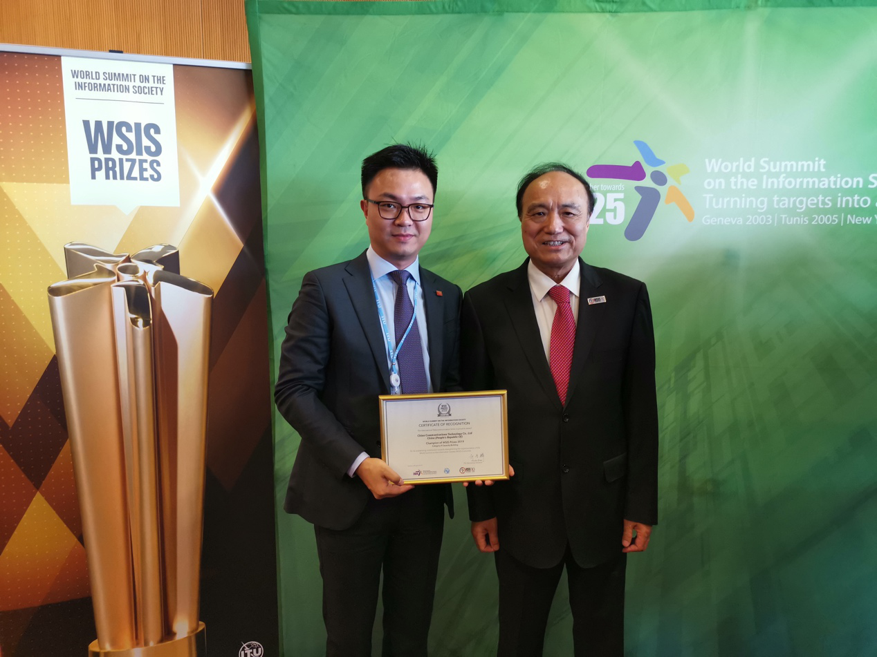 【图片说明:国际电联秘书长赵厚麟为中国联通、中邮建获奖项目颁奖。】