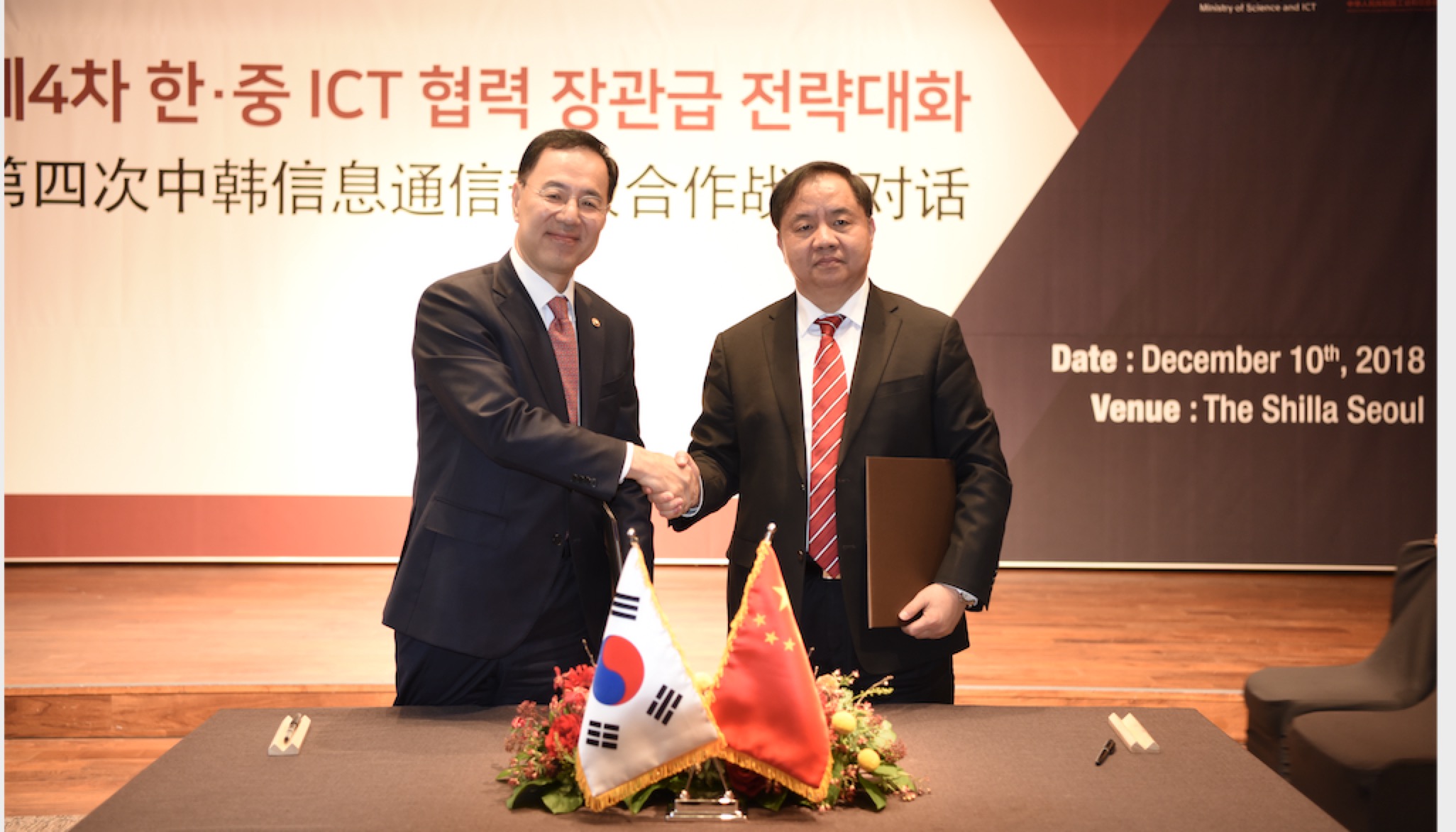 2018年12月10日,由中国工业和信息化部与韩国科学技术信息通信部共同举办的第四次中韩信息通信合作部级战略对话在韩国首尔召开,工业和信息化部副部长陈肇雄与韩国科学技术信息通信部副部长闵元基共同出席会议并致辞。中韩双方就5G、大数据、人工智能、车联网、网络安全、工业互联网等议题进行了交流研讨,达成了广泛共识,确定了下一步合作重点。陈肇雄和闵元基代表双方签署了会议纪要。