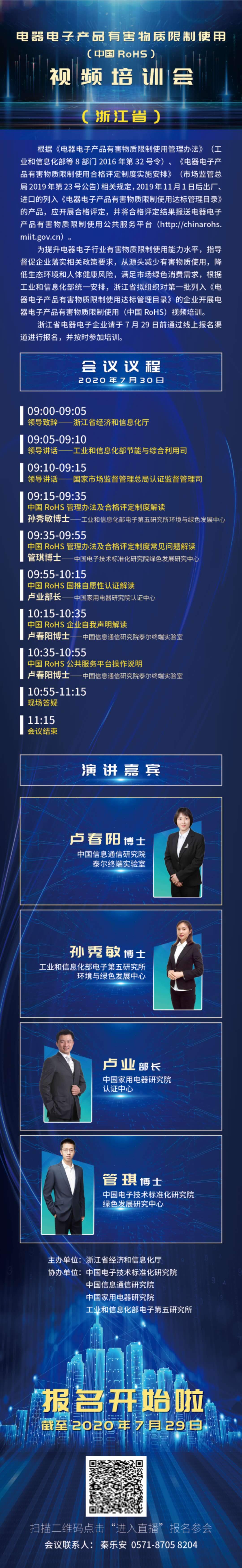 为贯彻落实《电器电子产品有害物质限制使用管理办法》《电器电子产品有害物质限制使用合格评定制度实施安排》,深入推进浙江省电器电子产品生产企业有害物质限制使用工作,浙江省经济和信息化厅定于2020年7月30日召开线上视频培训会,帮助省内电器电子产品生产企业、进口企业正确理解国家相关政策要求。