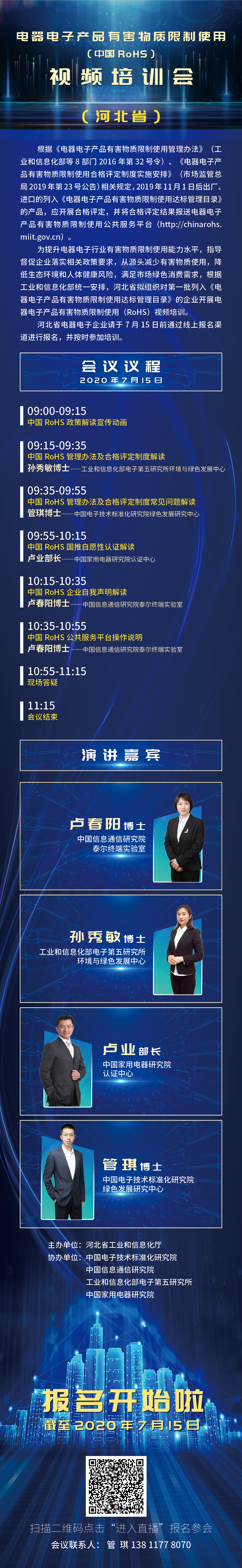 为贯彻落实《电器电子产品有害物质限制使用管理办法》《电器电子产品有害物质限制使用合格评定制度实施安排》,深入推进河北省电器电子产品生产企业有害物质限制使用工作,河北省工业和信息化厅定于2020年7月15日召开线上视频培训会,帮助省内电器电子产品生产企业、进口企业正确理解国家相关政策要求。
