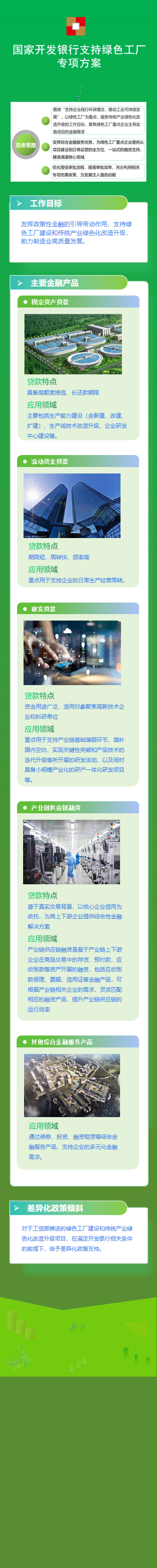 对于工信部推送的绿色工厂建设和传统产业绿色化改造升级项目,在满足开发银行相关条件的前提下,给予差异化政策支持。