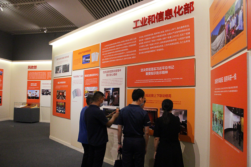 在工业和信息化部展区,大家长久地驻足停留,仔细浏览学习我部在坚决贯彻落实习近平总书记重要指示批示精神、建立巡视巡察上下联动格局、抗击新冠肺炎疫情中践行初心使命、发挥行业科技力量助力脱贫攻坚等板块内容,并积极交流有关工作认识和体会。