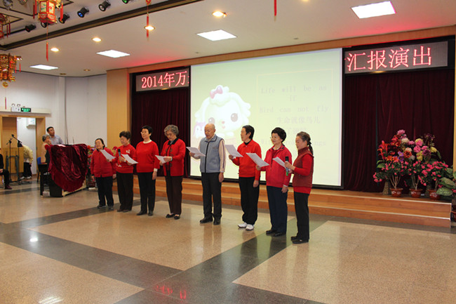 汇报演出了11台节目,以绢花秧歌《欢天喜地庆新春》拉开序幕,舞蹈班学员们以优美的舞姿表演了藏族舞蹈《月亮》、《小苹果》节目,展示丰硕的学习成果。声乐班学员合唱了《喀秋莎》、《金瓶似的小山》,歌声宛转悠扬,令人回味,展现了老同志们和谐乐观的精神面貌。太极班的学员们以《云海日出》、《42招太极剑》,来诠释他们对太极文化的理解。葫芦丝班的《让我听懂你的语言》、《夫妻双双把家还》曲调优美,意蕴悠长。电脑班、英语班、诗词班也以图文、音乐、朗诵等形式展示了丰富的学习内容和乐趣。