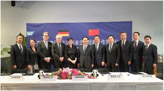 在SAP考察期间,彭清华书记、王卫东公参、孔翰宁博士(德国科学和工程院原院长、SAP原首席执行官、德国工业4.0之父、德国工业4.0平台全球代表)、欧思华执行董事共同见证了四川省“互联网+中小微企业创新创业公共服务平台”与SAP签署全面深入合作协议。下一步,签约双方将在四川中小企业全球化市场开拓、中小微企业创新服务、智慧企业建设、中小企业服务生态系统建设和生态资源互换等方面开展深度合作,共同构建“智能+企业服务”新模式。