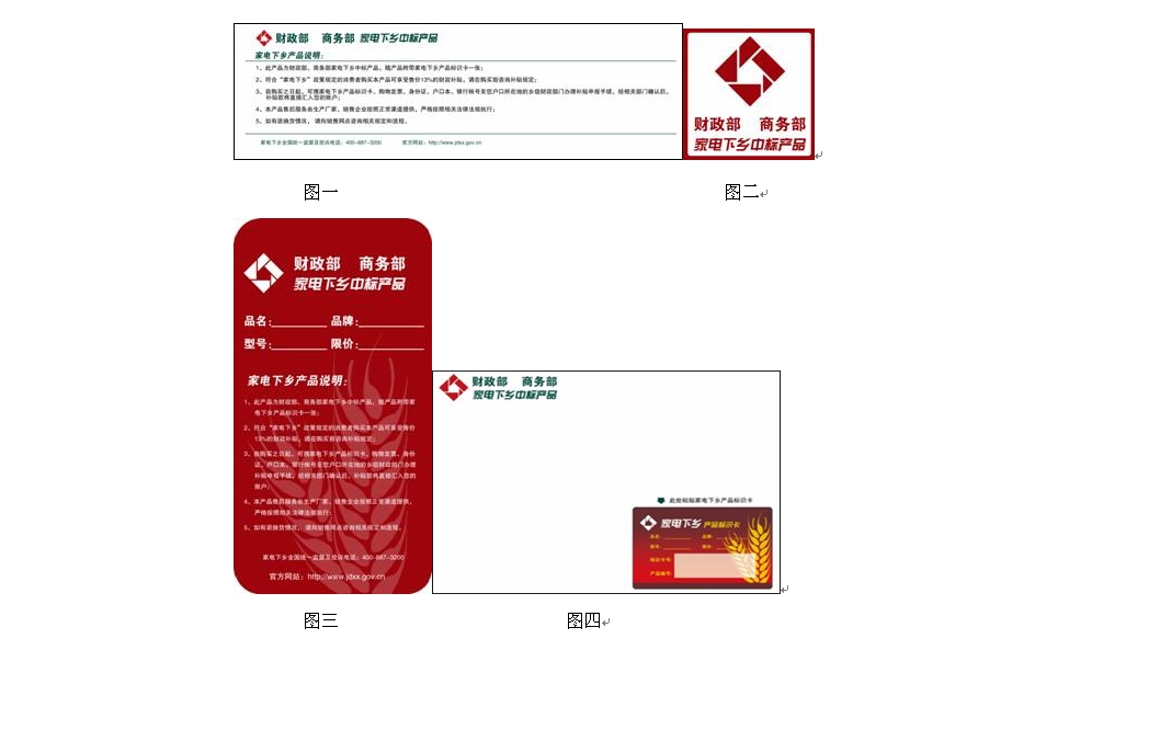 答:为了便于农民识别,商务部、财政部特别制定了家电下乡产品标识。家电下乡产品外包装的正前面(手机的包装应为正上面即顶部)应印制家电下乡中标产品标识及“财政部商务部家电下乡中标产品”字样(图一);洗衣机、彩电、冰箱(冰柜)外包装的左侧面右上角应印制家电下乡产品说明(图二);手机的外包装应在正前面印制家电下乡产品说明(图三);家电下乡产品使用说明书封面左上角应增加家电下乡专用标识及“财政部商务部家电下乡中标产品”字样,右下角粘贴有“家电下乡产品标识卡”(图四)。