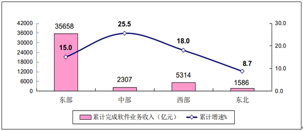 东、西部地区软件业收入保持较快增长,中部地区增势突出。1-8月,东部地区完成软件业务收入35658亿元,同比增长15.0%,增速与去年同期持平。中部地区完成软件业务收入2307亿元,增长25.5%,增速同比提高8.5个百分点,高出全国平均水平10.6个百分点。西部地区完成软件业务收入5314亿元,增长18.0%,增速同比提高3.6个百分点。东北地区完成软件业务收入1586亿元,同比增长8.7%,增速同比回落0.3个百分点。四个地区软件业务收入在全国总收入中的占比分别为:79.5%、5.1%、11.9%和3.5%。