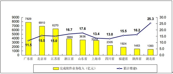 主要软件大省收入保持两位数增长,部分中西部省市增长迅速。1-8月,软件业务收入居前列的广东(同比增长11.5%)、北京(增长15.5%)、江苏(增长15.0%)、浙江(增长16.7%)、山东(增长17.6%)和上海(增长13.4%)完成业务收入合计32050亿元,占全国比重为71.4%,其中浙江、山东增速分别高于全国平均水平1.8个、2.7个百分点。增速居前5名的省市有:云南(增长85.0%)、广西(增长82.7%)、江西(增长72.0%)、海南(增长55.8%)和安徽(增长30.2%)。