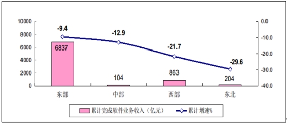 东部地区软件业收入下降幅度相对较小,西部和东北地区降幅较大。1-2月,东部地区完成软件业务收入6837亿元,同比下降9.4%。中部地区完成软件业务收入104亿元,同比下降12.9%。西部地区完成软件业务收入863亿元,同比下降21.7%。东北地区完成软件业务收入204亿元,同比下降29.6%。东中西和东北四个地区软件业务收入在全国总收入中的占比分别为:85.4%、1.3%、10.8%和2.5%。