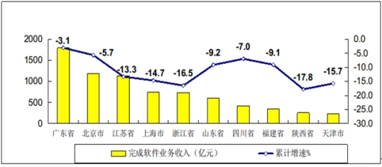 主要软件大省业务收入不同程度下降。1-2月,软件业务收入居前5名的广东、北京、江苏、上海、浙江软件业务收入分别下降3.1%、5.7%、13.3%、14.7%、16.5%,五省市合计软件业务收入占全国比重为69.7%。