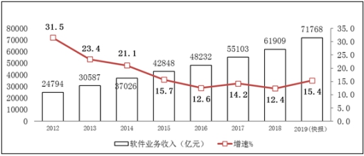软件业务收入保持较快增长。2019年①,全国软件和信息技术服务业规模以上②企业超4万家,累计完成软件业务收入71768亿元,同比增长15.4%③。
