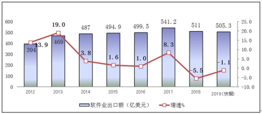 软件出口形势低迷。2019年,全国软件和信息技术服务业实现出口505.3亿美元,同比下降1.1%。