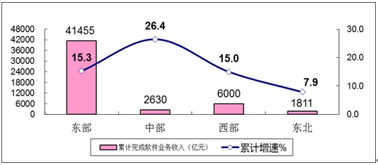 东、西部地区软件业收入保持较快增长,中部地区增势突出。前三季度,东部地区完成软件业务收入41455亿元,同比增长15.3%,增速较去年同期持平。中部地区完成软件业务收入2630亿元,增长26.4%,增速同比提高8.6个百分点,高出全国平均水平11.2个百分点。西部地区完成软件业务收入6000亿元,增长15.0%,增速同比提高0.2个百分点。东北地区完成软件业务收入1811亿元,同比增长7.9%,增速同比回落1.4个百分点。四个地区软件业务收入在全国总收入中的占比分别为79.9%、5.1%、11.5%和3.5%。