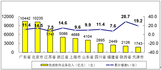 主要软件大省业务收入增速持续回升。前三季度,软件业务收入居前5名的省份中,广东、北京、江苏、浙江和上海软件收入分别为10442亿元、10235亿元、7741亿元、5086亿和4688亿元,分别增长11.4%、14.5%、7.5%、14.6%和9.6%,分别较上半年提高3.2个、4.7个、2.4个、3.6个和6.7个百分点,五省市合计软件业务收入占全国比重为65.4%,较上半年下降0.7个百分点。