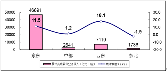 东、西部地区软件业收入保持较快增长。前三季度,东部地区完成软件业务收入46891亿元,同比增长11.5%。中部地区完成软件业务收入2641亿元,同比增长1.2%。西部地区完成软件业务收入7119亿元,同比增长18.1%。东北地区完成软件业务收入1736亿元,同比下降1.9%,四个地区软件业务收入在全国总收入中的占比分别为:80.3%、4.5%、12.2%和3.0%。